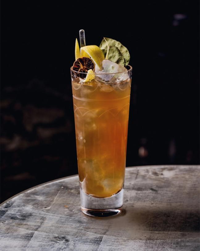 The Collins was originally made with a spirit, such as gin or whisky, sugar, lemon juice and carbonated water (seltzer) – another invention that was introduced in the British capital during the 1790s. The Faraway Collins then heads eastward, stopping in Japan to meet the juice of the yuzu: a fruit that combines the strong citrus of lemon with the heady floral notes of wild mandarin oranges and a delicate lime blossom aroma. Journeying south to Australia, it acquires its aromatic sweetness from our house-made Eucalyptus Syrup (page 244), which imparts the cooling sensations of menthol, citrus and pine. Finally, this refreshing cocktail meets the intensely root beer-like qualities of Sarsaparilla-infused Soda Water, with its hints of wintergreen, liquorice, black cherry bark, sweet birch and cinnamon.