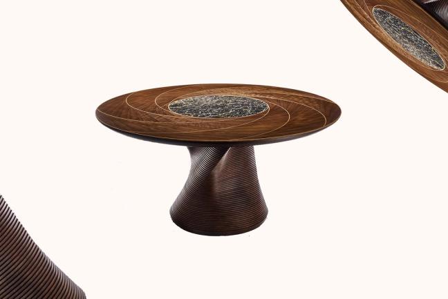 Flowing like the pleats of a dress, the sculptural base supports a stunning tabletop and features veneers that swirl around a lazy Susan hewn from marble. The table seats eight in comfort — not to mention style.
