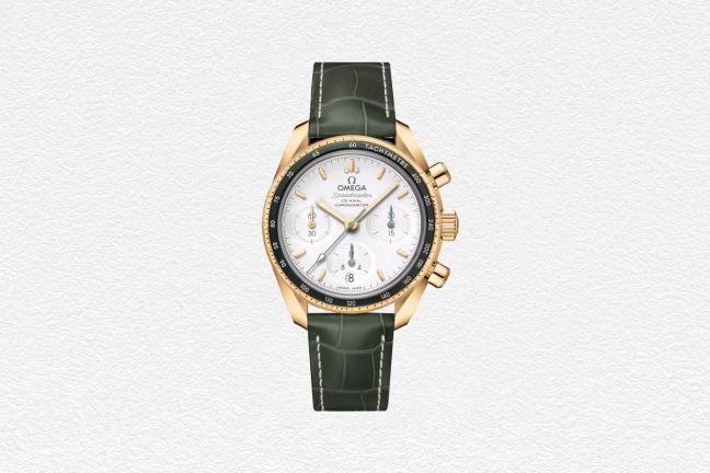 The Speedmaster is an icon. It was the first watch on the moon and its legacy lives on. The Speedmaster 38 mm collection has been crafted with simplicity in mind, yet still retains the look and heritage of Omega's famous chronograph. This model has a full 18 carat yellow gold case with a polished-brushed gold bezel, which includes a tachymeter scale on a green aluminium ring. The indexes are made of 18 carat yellow gold while the hands are either 18 carat yellow gold or varnished green. As handsome as they come, this is a Speedmaster worthy of the name.