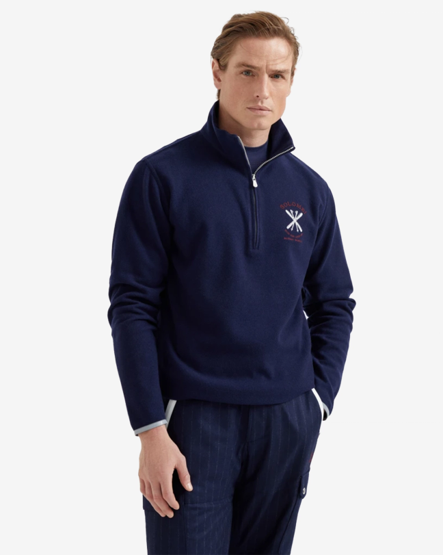 Inspired by classic technical mountain gear, this mock neck sweatshirt combines function and refined materials in a versatile garment. It is made using Brunello Cucinelli's own techno fabric - a compact cashmere and cotton material inspired by the classic materials of athletic wear - which ensures lightness and a distinct feeling of softness, while maintaining the comfort and elasticity necessary for the slopes.