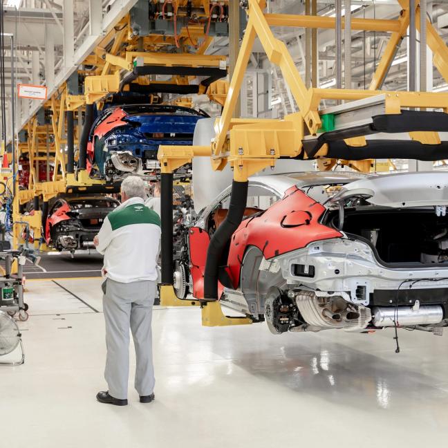 Even though few robots are used throughout the factory, the assembly line feels like a well-oiled machine. The new shells, already painted in colours ranging from the popular Sequin Blue to the deep red, playfully named Cricket Ball, buzz down onto the slowly advancing floor — where they are immediately set upon by scores of single-minded workers.