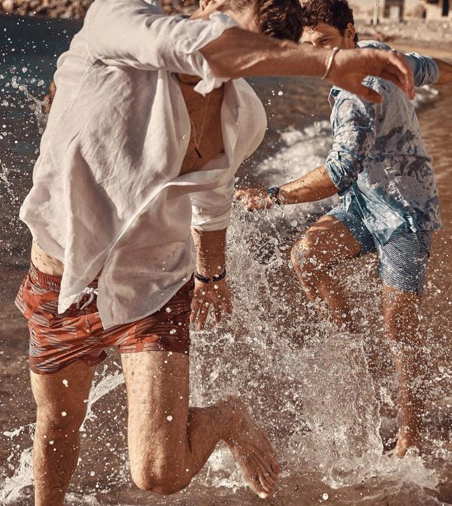 Accordingly our group of gents find something for every stage of their trip in the collection. Patterned swim shorts are paired with linen-blend T-shirts for a splash in the ocean at Villefranche-sur-Mer while camp collar shirts are the perfect foil for the midday sun on board a yacht in Plage Mala.