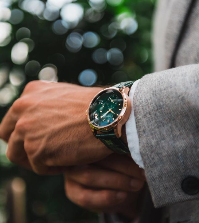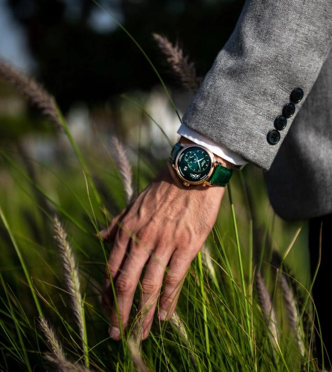 How? Because the brand has gone all-in with its green theme. Aside from that red gold case, almost every detail is rendered in the vibrant, verdant colour. The handcrafted dial starts as an intense dark green in the centre, before gradually darkening to a deep black at its edges. The fine ridges and Dégradé effect on the subdials offer glimmering, shimmering new shades of the colour when the light catches the watch’s face. Even the strap, stitched from Louisiana alligator leather, is buckled up in a glossy, rich green.