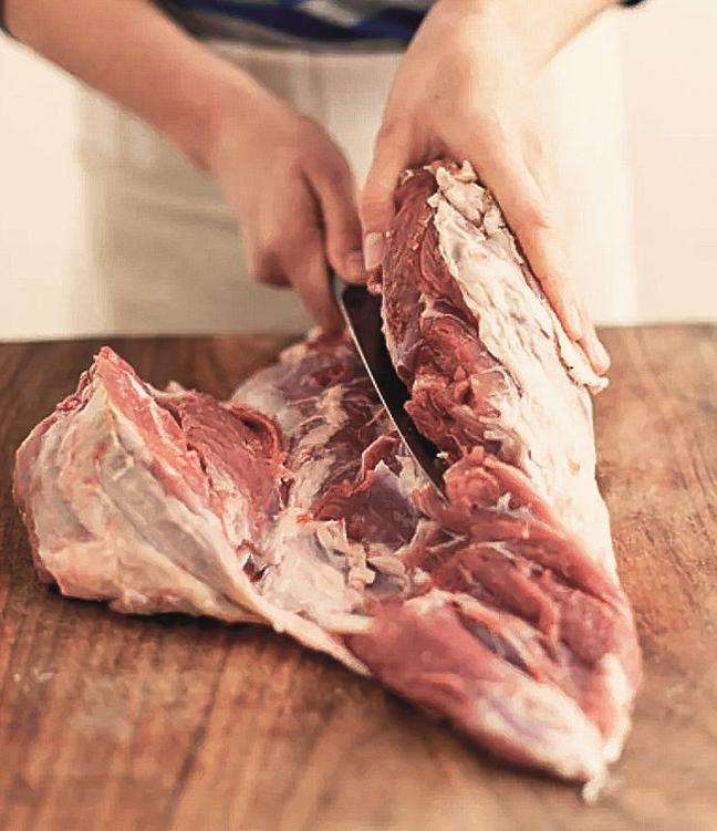 Once the bone is out, discard it and lay your leg of lamb flat on a chopping board with the skin side facing down. Take your knife and make a clean horizontal incision into the thicker flesh on each side of the leg. Fold the meat outward like you’re opening a book.