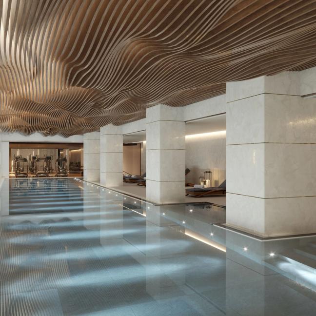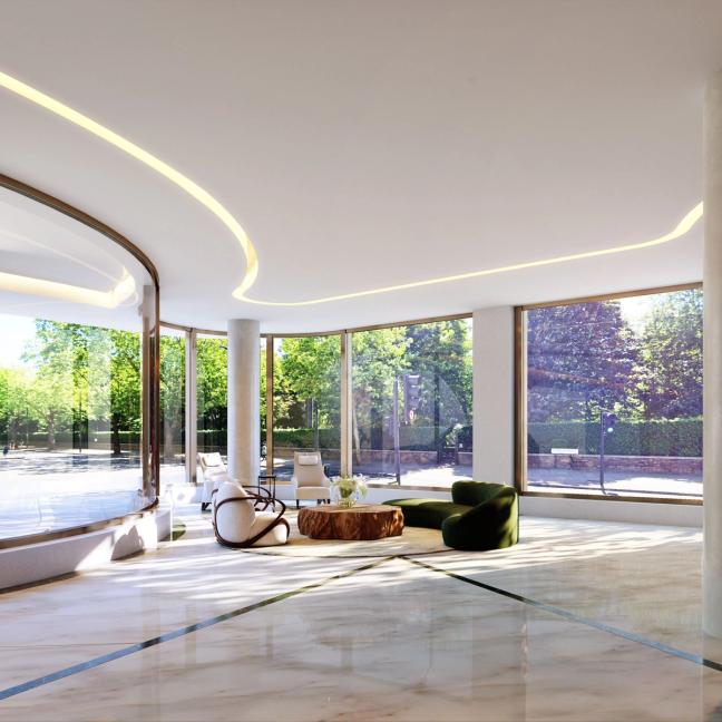 The porte cochère is in the covered driveway and opens onto a double-height lobby, which spans the entire depth of the building. In addition to the aforementioned pool, the wellbeing floor boasts a 16 sofa seat cinema, a glass-walled gym and an adjoining spa and leisure suite.