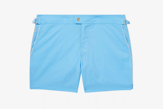 Thanks to its poppy hue that sits in the middle of pastel and bold, as well as its contrasting white piping, this Tom Ford option has drawn our heads for its retro-style sophistication. The overall look, and the flash of blue, somewhat reminds us of that celebrated sea-surfacing scene in Casino Royale – and, the adjustable buckled waist tabs allow you to constantly change the tightness, depending on how much summer-holiday feasting is to be done.