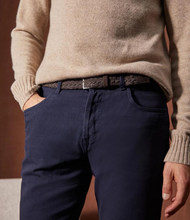 For knitwear that’s a bit lighter, consider the country crew neck in cashmere, as its medium-weight feel (375g) is suitable for the transitional seasons. Details, such as its ribbed neckline and cross-stitch collar also give it a considered, distinguished look. Worthy of note, too, is Luca Faloni’s well-fitted stone-grey pure-cashmere hoodie that can either be layered under a coat or worn as a main piece of outerwear on warmer days.