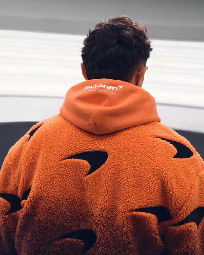 You'll find ombré fleece jackets and luxe leather biker jackets stamped with the McLaren F1 Team and motorsport-inspired logos and insignia. One of the key pieces in the collection is the McLaren F1 team embroidered fleece, which is available in black and cream. It features the 'McLaren' graphic across the back of the fleece, which comes in the team's staple papaya orange.