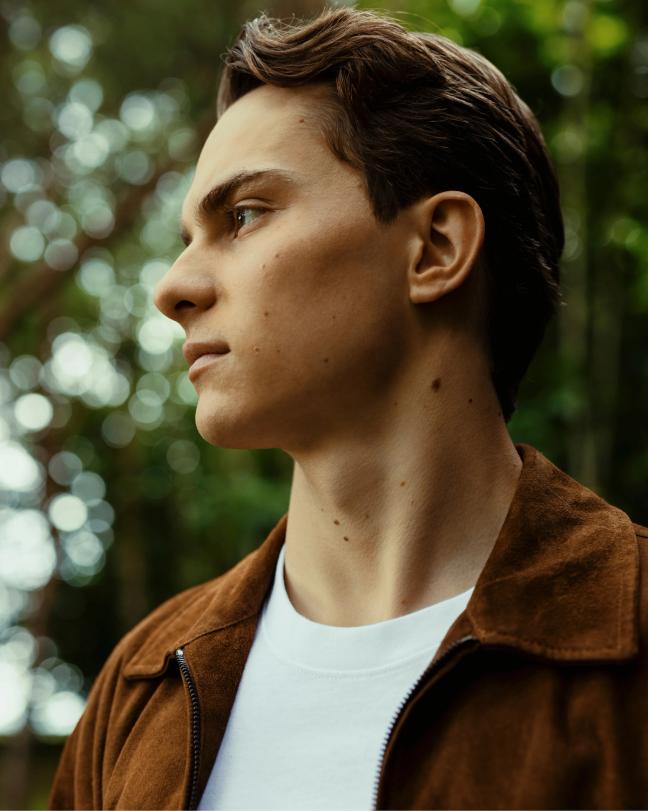 SLOWEAR Montedoro Suede Jacket, £1,345, slowear.com; LEVI’S Trademark T-shirt, £25, levi.com