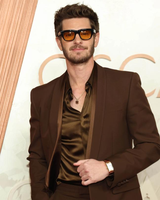 Garfield made a sophisticated statement by choosing to wear a Jaeger-LeCoultre Reverso Tribute Duoface Calendar in pink gold, which was a complimentary timepiece to his chocolate brown Gucci suit. Equipped with the Manufacture Calibre 853 with manual winding, combining the Duoface with a complete calendar, the Reverso Tribute Duoface Calendar offers two magnificent faces.