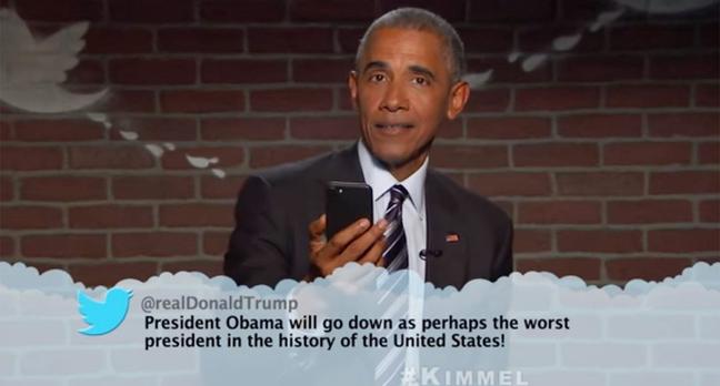 Not one to take himself too seriously, Obama appears on the Jimmy Kimmel show to read mean tweets about himself.