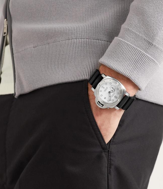 From an ‘everyday’ watch to a tool watch engineered for a specific, deep-diving purpose. Panerai’s ‘Submersible’ models are as instantly recognisable as the Cartier Tank above, but they have bulky, brushed stainless steel cases — and this particular white-dialled version boasts a power reserve of up to three days.