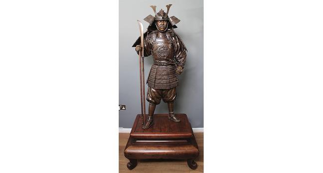 It is an almost life sized Japanese bronze Samurai warrior, dating from circa 1900. It is 185cm to the top of his helmet (including base) and 214cm high (including base) if you measure right to the top of his Naginata (long handled blade).