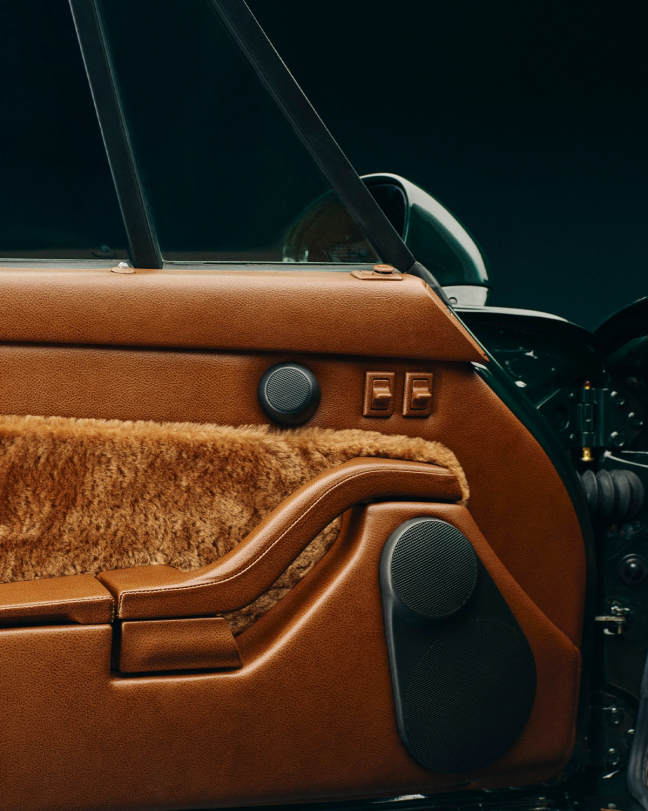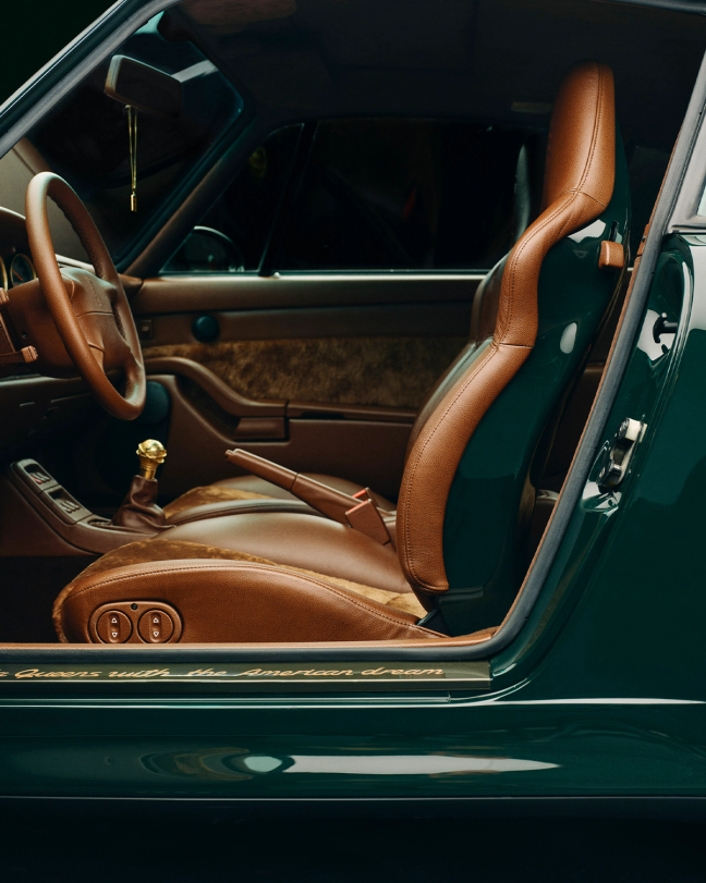 Inside the car offers up the cosiest drive possible. Dark brown leather, lambswool accents and hardback seats are complimented by teddy bear brown carpets and furry details on the dashboard. A custom gold Unisphere gear knob – the Unisphere is the iconic globe that’s a symbol of Queens, the New York City borough in which Aimé Leon Dore was founded – and door sills featuring the phrase ’A team from outta Queens with the American dream’ give it the Aimé Leon Dore edge.