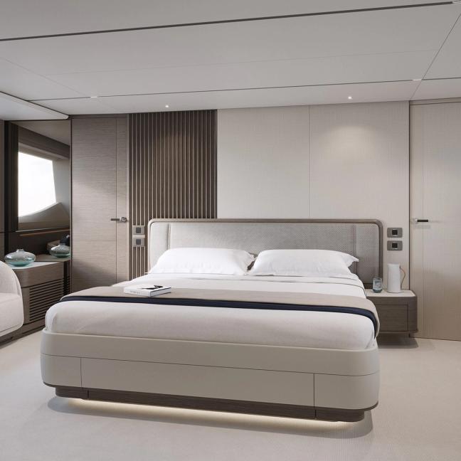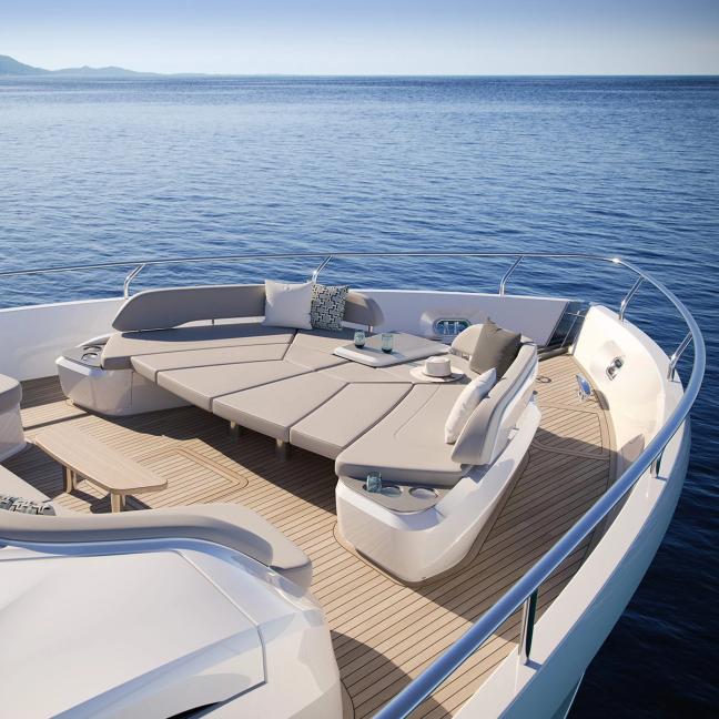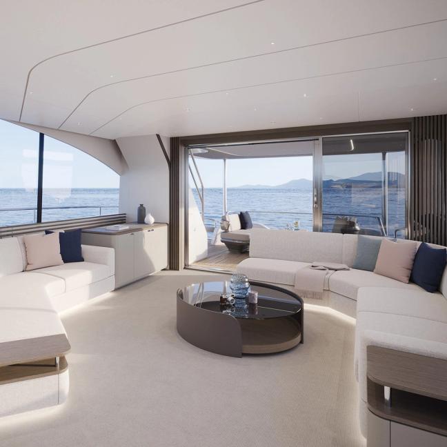 The spacious main deck offers even more in the way of luxurious touches. And, from the cockpit to the helm area to the vast, panoramic windows that encircle the saloon, each specific zone gives way to the next in an uninterrupted, seamlessly connected flow.