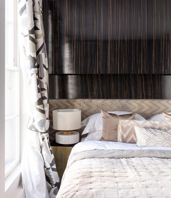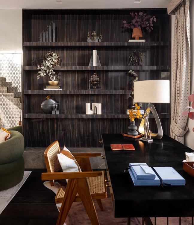 The opulent master bedroom suite, in particular, is a treat. Occupying the entire first floor, the space ushers you in through a cosy corridor of sage-green panelled wardrobes. Dark wood detailing and a symphony of complementary textiles give way to plush grey carpets, which themselves lead seamlessly to the bedroom’s bold ensuite bathroom.