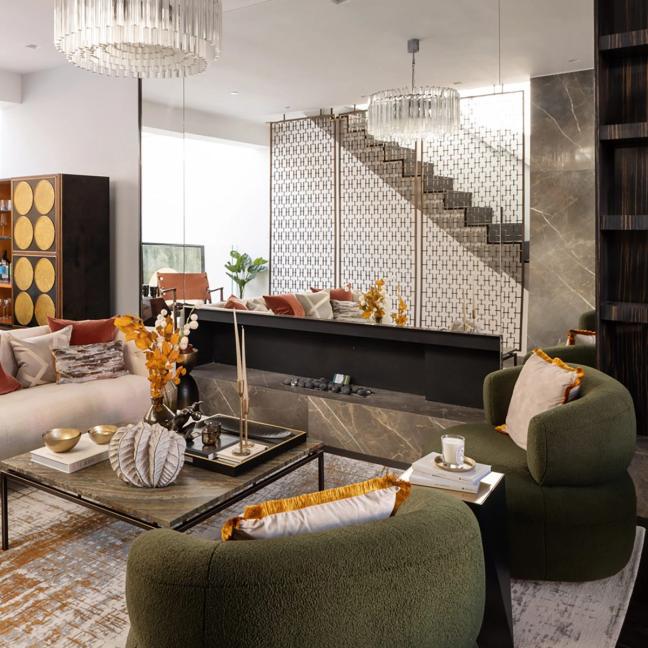 Around the ground-floor reception room, you’ll spot marble accents, dark wood floors and an ornate, gilded metal screen. There’s a large mirror — set above a modern fireplace — that amplifies the swathes of sunlight that pour in through the handsome sash windows. And a vast glass balustrade frames a dynamic double-height, open-ceiling space connecting the reception room with that lavishly-appointed kitchen-diner below.