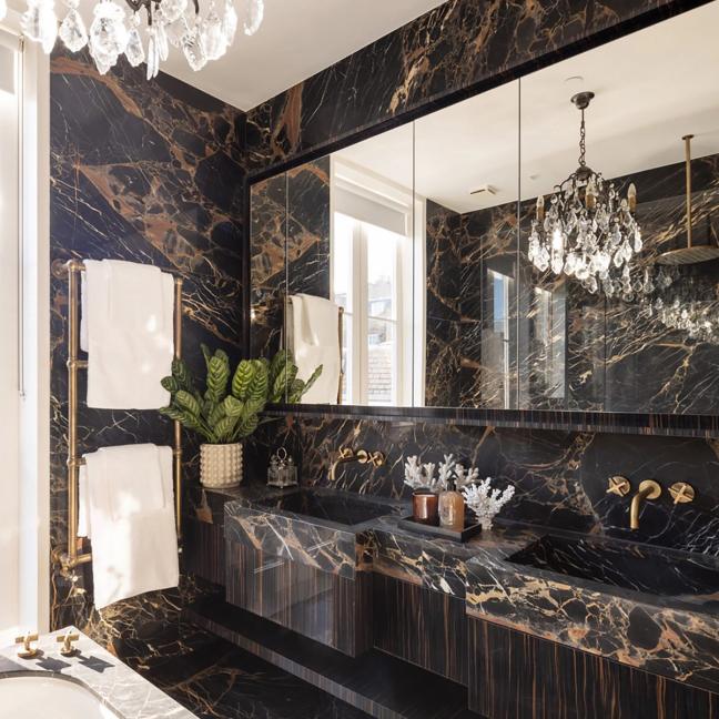 But this bathroom — despite its brushed golden taps and sparkling crystal chandelier — isn’t even the most refined relaxation area in the property. Descend the wide staircase to the basement level, and you’ll find a remarkable use of subterranean space; a one-of-a-kind, blue-hued marble pool. It’s an exquisite addition to a traditional home — a cutting-edge showpiece accentuated by a glass roof that filters soft sunlight by day, and pairs the sparkle of stars with the glow of gentle lighting after dark.