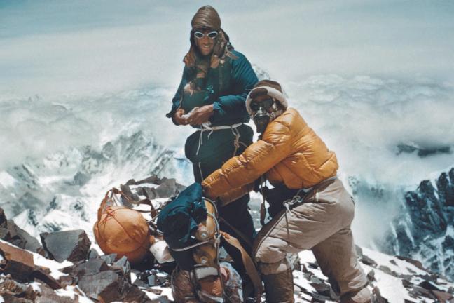 Hillary and Tenzing approaching highest camp on Everest at 8500 m
