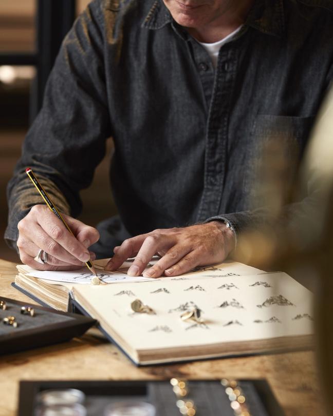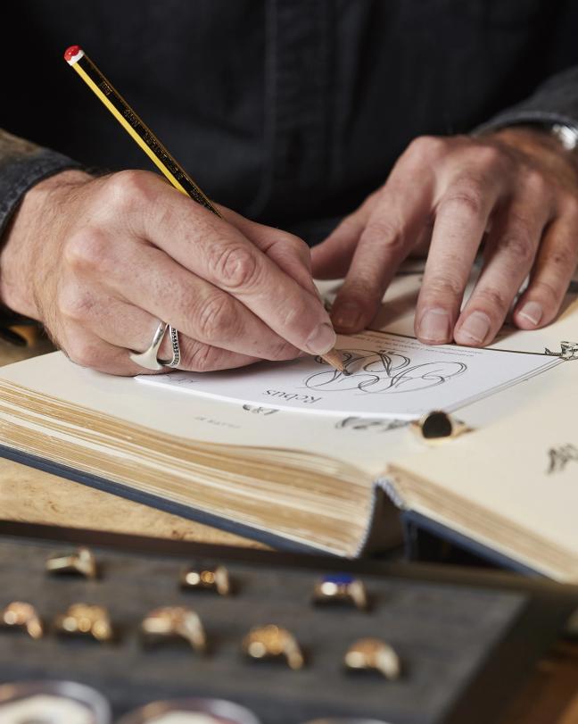 Rebus Director Emmet Smith has been engraving for years and, while he now hires some of the best engravers in London rather than slipping on the loupe himself, the craftsman-cum-businessman is still the cornerstone of the company. We headed down to his studio to sketch out designs for our own ring.