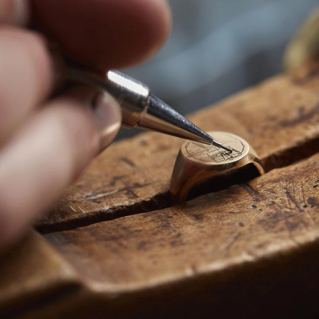Firstly, the engraver hand draws your crest or emblem onto the surface of the ring. Then, with a different tool for each type of line, mark or letter, he gets to work. The gold is etched away, the ring is rotated as he goes, and the design takes shape.