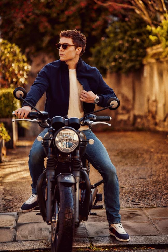 Breitling Chronomat B01 42, £6,650; Connolly navy cashmere blouson, £1,950; Ralph Lauren Cashmere jumper, £395; Sunspel classic cotton t-shirt, £70; Curry & Paxton Alex sunglasses, £149