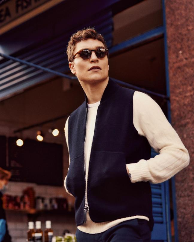Below, the Connolly navy gilet adds a dash of driving prep to proceedings. With its straight cut, crisp lines and broad patch pockets, however, this one happily avoids the chinny overtones of some sleeveless numbers.