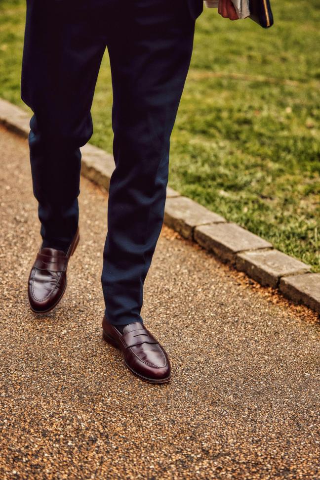 Crockett & Jones Boston burgundy loafer, £405; New & Lingwood navy blazer,