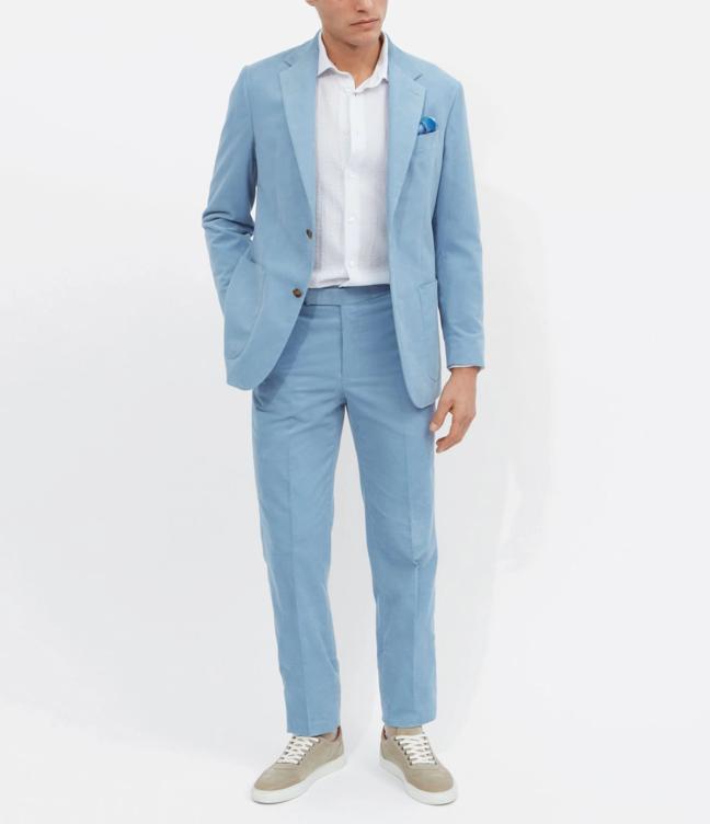 Back to blue — and onto Savile Row — for our next suiting suggestion. Richard James is known for its bold colours and modern tailoring, and this sky blue suit makes use of an underused material; needlecord. A type of tighter, subtler corduroy, it’s a great option for summer weddings — adding texture to your get-up without the unwelcome weight.