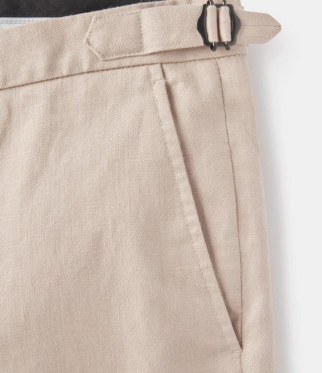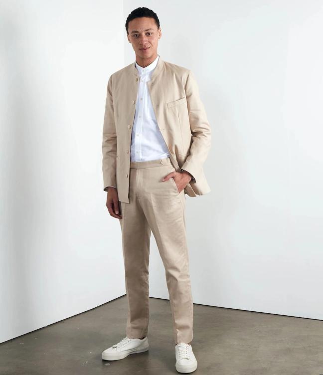 For something a little different, why not cut off your collar, do away with lapels and button up a Nehru jacket? Crafted from a sand-coloured linen with a smooth texture, this English-made option from SIRPLUS is effortlessly elegant and fastens with natural mother of pearl buttons for an elegant finish.