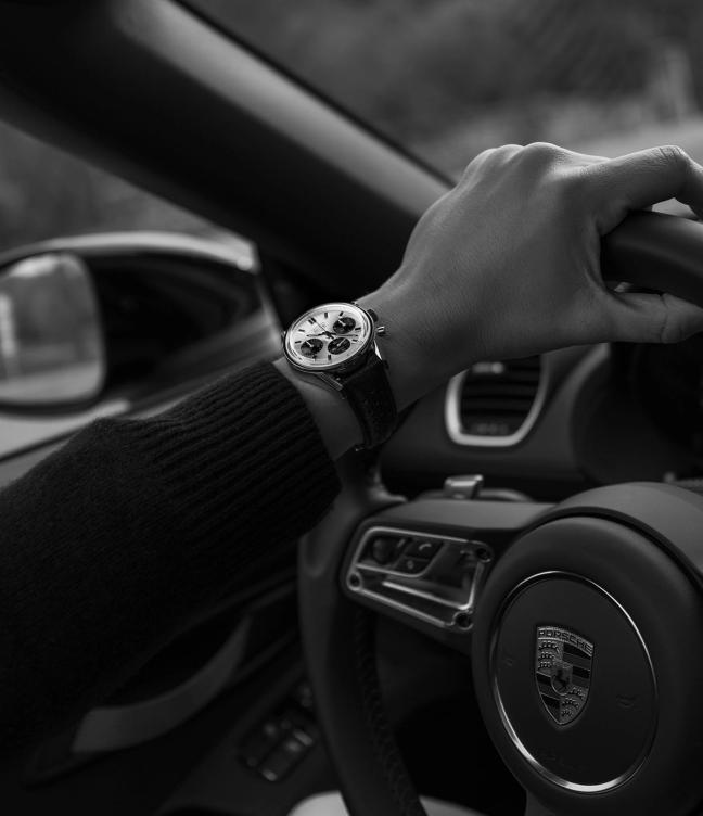 A truly stylish paean to its predecessor, the latest release incorporates that iconic panda look, and featured on the silver sunray-brushed dial is a throwback Heuer logo and the Carrera moniker. Black stripes, once again, cut through the hour markers, and a trio of black counters are faced with high-contrast white hands. Beige lume, rather cleverly and subtly, prevents it all from appearing too monochrome.