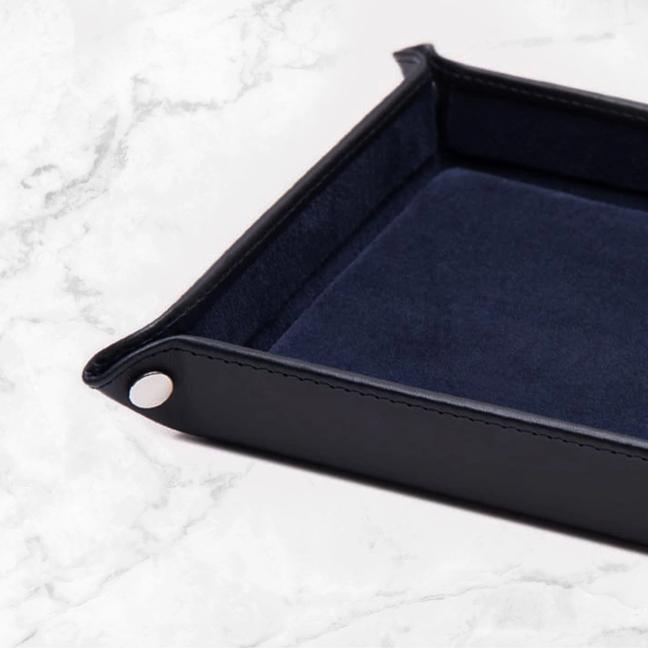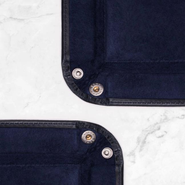 With snap fasteners in the corners, the tray can be flattened during transit — and then popped up as soon as you check-in. This way, you can keep everything from loose change to room keys, cufflinks to collar stays, safe in your suite. And, in this sleek navy colour from Ettinger’s Lifestyle Collection, you’ll do so in inimitable style.