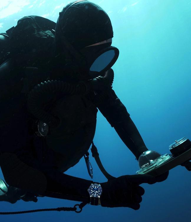 Military divers carry this out in pairs, tied to one another (via their watch strap) by a ‘life line’. One keeps an eye on a magnetic compass, swimming straight and true for an allotted time, counted down by the other using his Tudor. When the minute hand ticks past the bezel’s ‘zero’ triangle, the team tracks 90º the other way and another countdown commences.