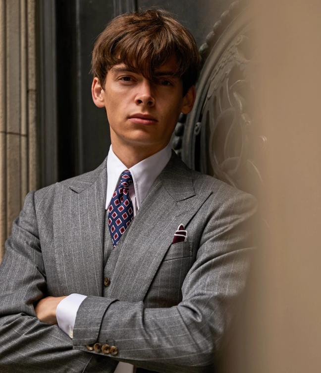 Ties, according to Mathias Le Fèvre, will never die. “And there’s quite the tale behind my favourite tie,” he reveals. “When first getting into tailoring in my teenage years, I treated myself to a preppy club tie from Eton. It was my first tie and I loved it so much that I had my nan embroider my initials on the back of it. It was my number one tie for years — until I lost it on a boozy night out in a Mayfair nightclub. I contacted the venue, but it was nowhere to be found.