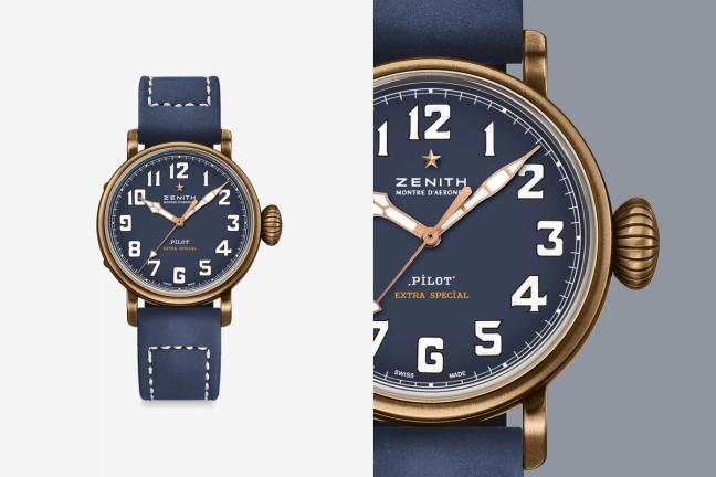 Adding a tasteful splash of colour to the world of bronze watches, Zenith have added a matt blue dial and blue oily nubuck leather strap to this timepiece to help compliment the colours that will come out of the bronze as it ages.