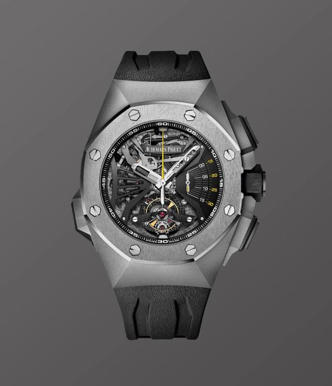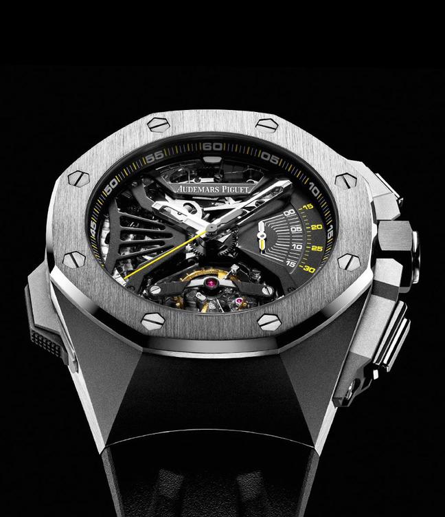 What do you see? An open-worked model from Audemars Piguet’s iconic Royal Oak range. There’s a titanium case and bezel, black ceramic pushpieces and glareproofed sapphire crystal. So far, so normal.