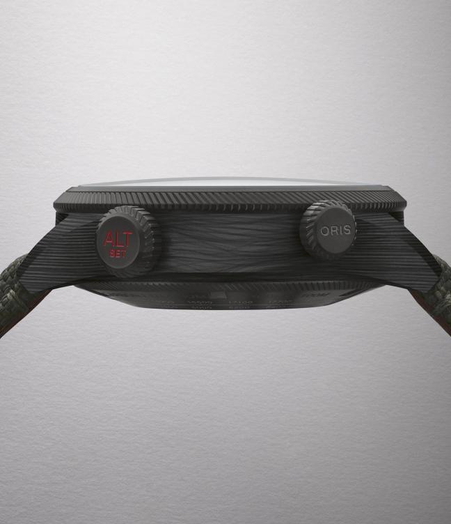 Flip the watch over, and you’ll see the same altitude scale etched into the grey PVD-plated titanium caseback. And, paired with a hardy green textile strap, lined with brown leather, everything about Oris’ latest is as capable as it is cutting-edge.