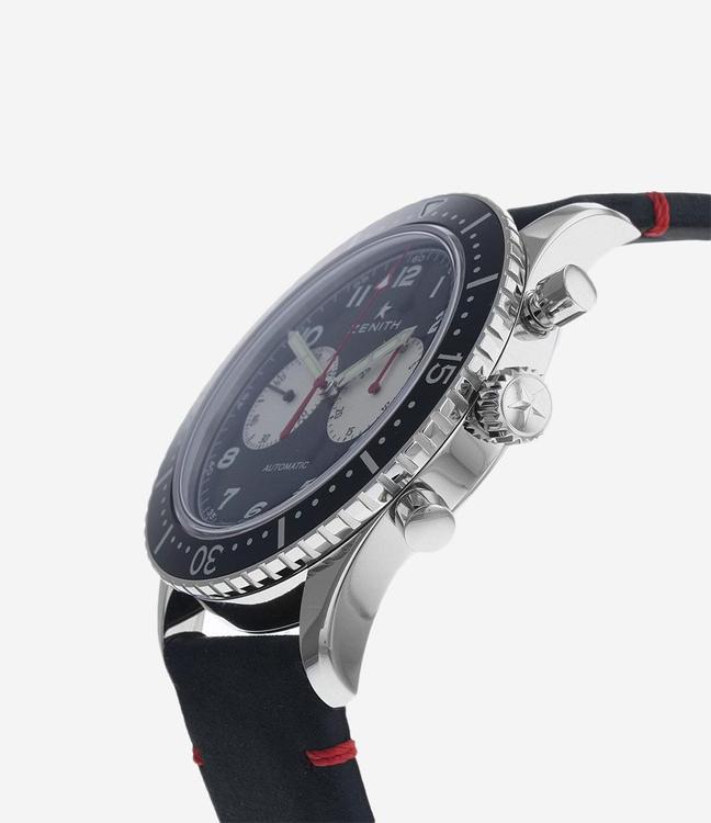 Similar to the standard model from the Zenith range, the latest Cronometro Tipo CP-2 replaces the previous black chronograph with all-new silver sub dials and red chrono hands. Moreover, the Arabic watch-markers still remain and the running seconds hand (positioned at nine o’clock) are coated in black – all of which are enclosed in a 43mm stainless steel case. When it comes to the subtle details, each model also has a special engraved caseback that displays a limited edition number and the strap is crafted from black nubuck leather with a red trim; this fuss-free colourway is perfect to wear with either a casual harrington jacket or a more formal two-piece.