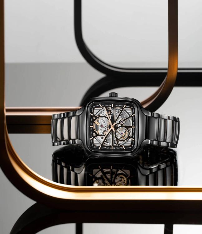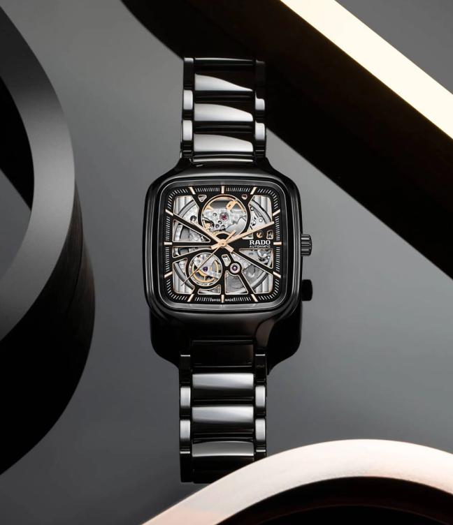 A new take on the iconic Rado shape, this is a high-tech timepiece. With a square injected monobloc ceramic case, it shows off an intricate automatic movement in unassertively open-worked style. Monochrome in colour — save for glimmers of rose gold — this watch bears many high-quality hallmarks of top-tier watchmaking, such as Côtes de Genève detailing on the movement holder. Ideal for those who appreciate true craftsmanship, and an eye for detail.
